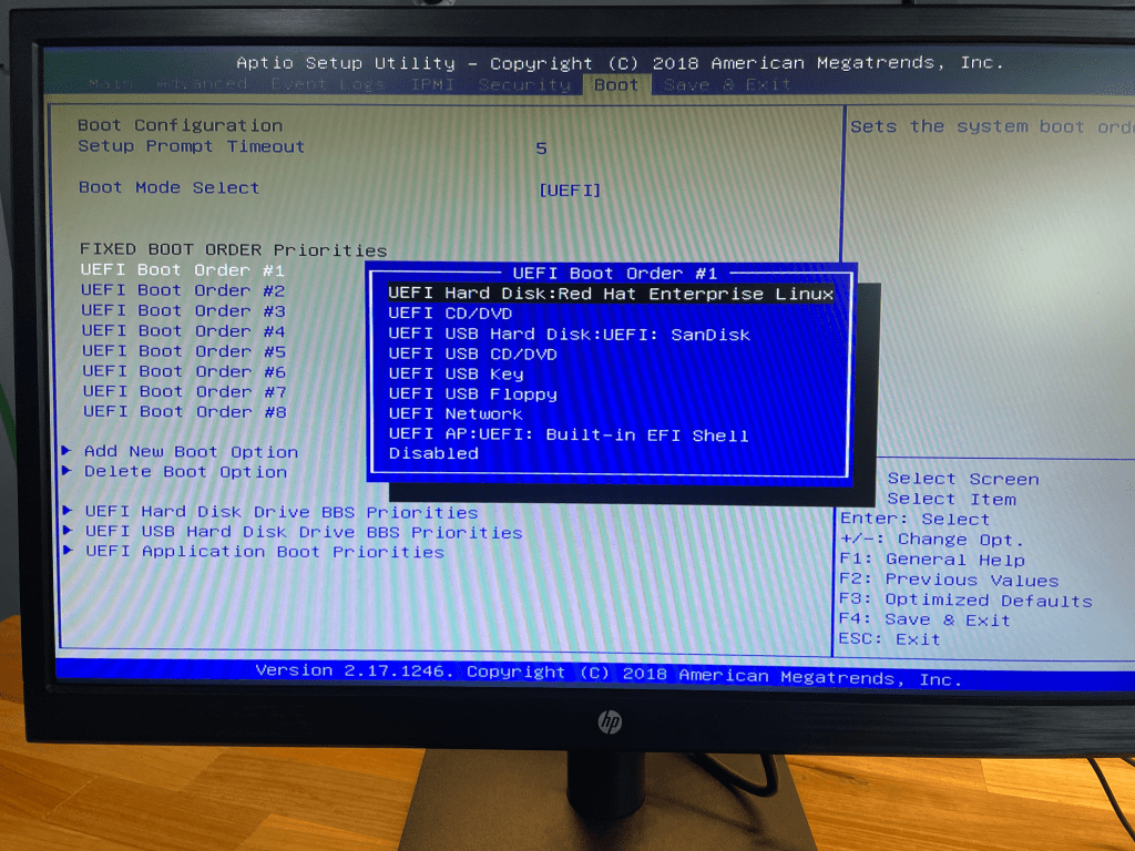 - On your server, on bootup hit Delete key to enter the Boot Menu and select the USB key that has the ISO as the primary