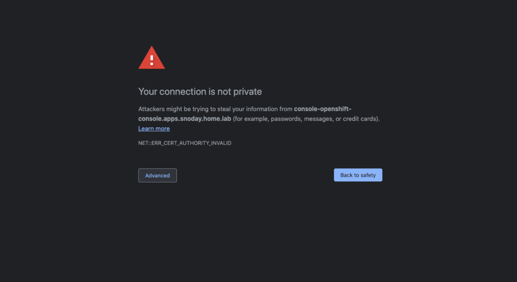 - If you get “Your connection is not private” error, OpenShift uses a self-signed certificate that you have to accept in order to access the console.