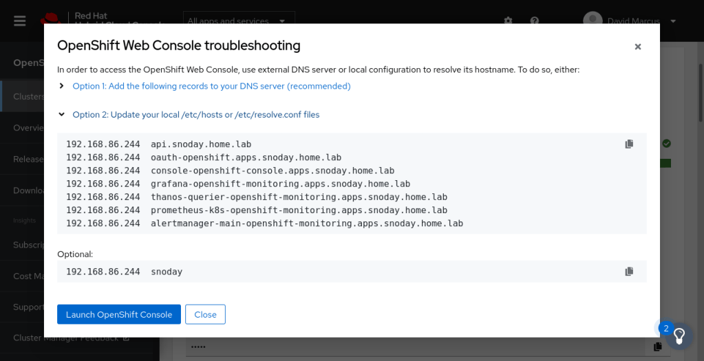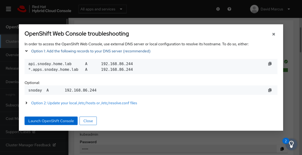 - From console.redhat.com/openshift, under Web Console URL click the “Not able to access the web console?” link