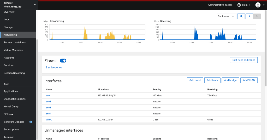 Checking the Cockpit Networking tab, virbr0 is operational.