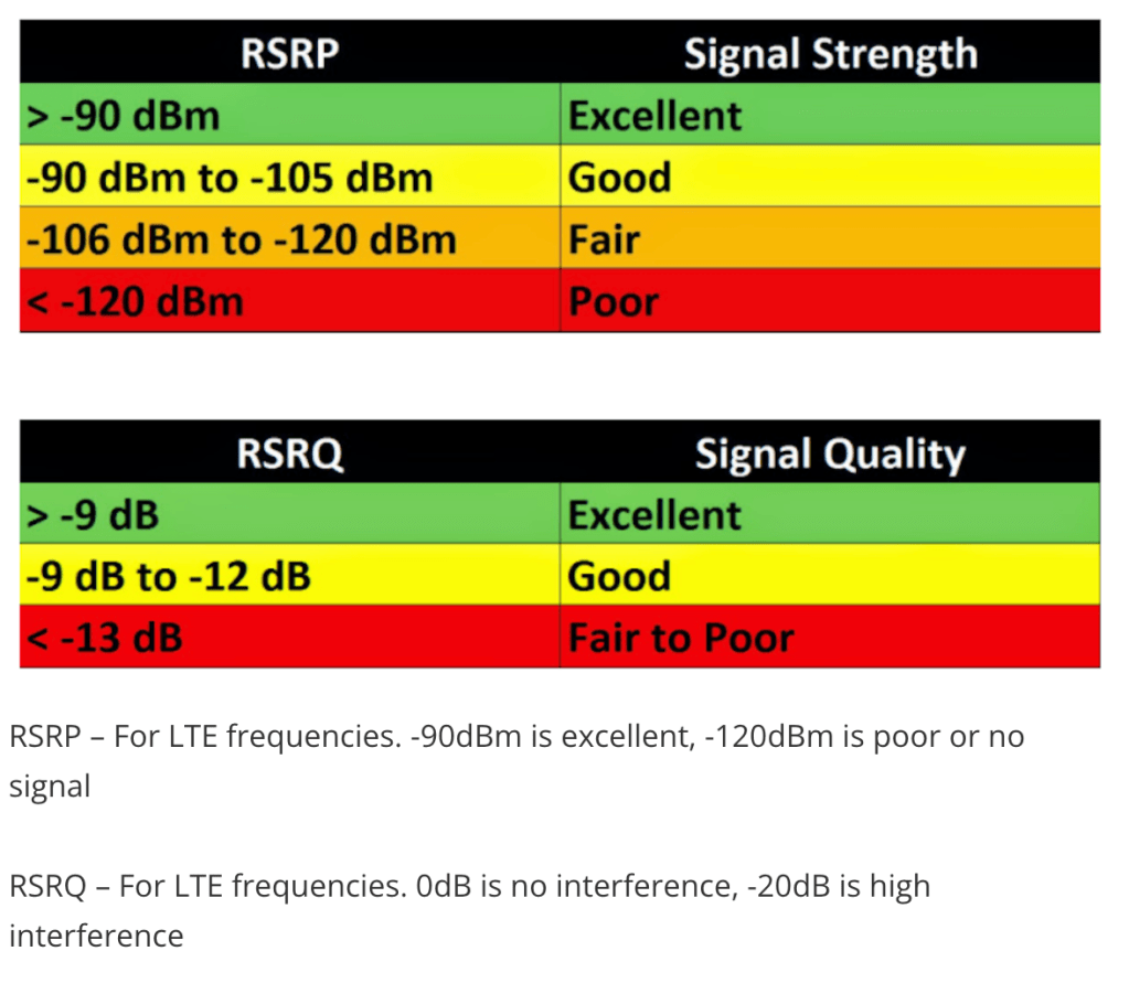 - Cell Signal Strength is best measure by RSRP (strength) and RSRQ (quality).